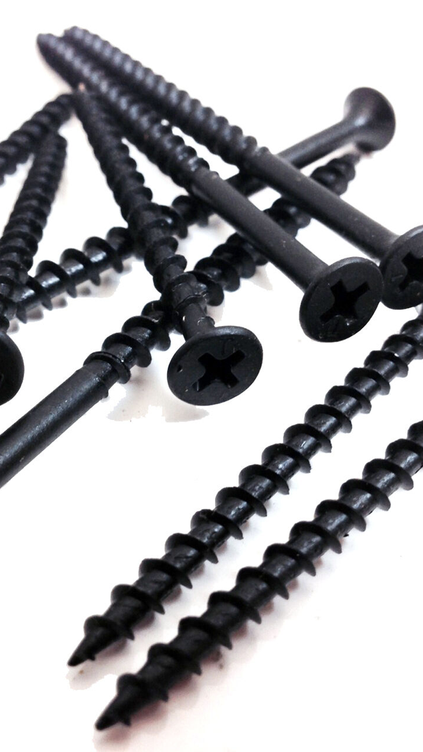 To resist corrosion, black drywall screws have a phosphate coating. Other types of drywall screws have a thin vinyl coating that makes them even more corrosion-resistant. Because these have slippery shanks, they are very easy to draw in. Here is an example of a black drywall screw with phosphate coating: (10000) #6 X 1/2” Drywall Screw Phillips Bugle-Head Coarse Thread Black Phosphate Bulk Box